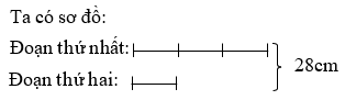Một sợi dây dài 28 cm được cắt thành hai đoạn, đoạn thứ nhất dài gấp 3 lần đoạn dây thứ hai. Hỏi mỗi đoạn dài bao nhiêu xăng-ti-mét?