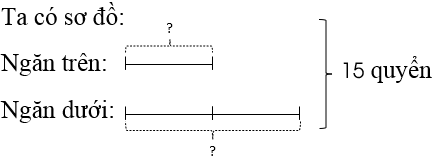 Một tủ sách có hai ngăn. Số sách ở ngăn trên bằng \(\dfrac{1}{2}\) số sách ở ngăn dưới. Tính số sách ở cả 2 ngăn biết trong tủ có 15 quyển sách.