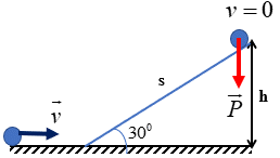 Một viên bi khối lượng m chuyển động ngang không ma sát với vận tốc 2 m/s rồi đi lên mặt phẳng nghiêng góc nghiêng \({30^0}\). Tính quãng đường s mà viên bi đi được trên mặt phẳng nghiêng.