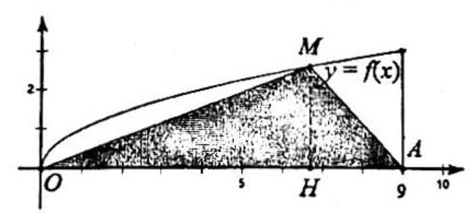 Cho đồ thị \(\left( C \right):y = f\left( x \right) = \sqrt x \). Gọi \(\left( H \right)\) là hình phẳng giới hạn bởi đồ thị \(\left( C \right)\), đường thẳng \(x = 9\) và trục \(Ox\). Cho điểm \(M\) thuộc \(\left( C \right)\) và điểm \(A\left( {9;0} \right)\). Gọi \({V_1}\) là thể tích khối tròn xoay khi cho \(\left( H \right)\) quay quanh trục \(Ox\), \({V_2}\) là thể tích khối tròn xoay khi cho tam giác \(AOM\) quay quanh trục \(Ox\). Biết rằng \({V_1} = 2{V_2}\). Tính diện tích \(S\) phần hình phẳng giới hạn bởi đồ thị \(\left( C \right)\) và đường thẳng \(OM\).