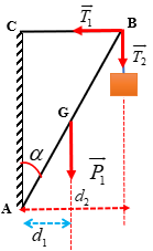 Một thanh đồng chất AB, có trọng lượng \({P_1} = 10N\), đầu A được gắn với tường bằng