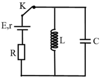 Dùng mạch điện như hình vẽ để tạo ra dao động điện từ. Biết \(E = 9V;r = 1\Omega ;R = 5\Omega \), cuộn dây thuần cảm có độ tự cảm L và tụ điện có điện dung \(C = 10\mu F\). Ban đầu đóng khóa K và đợi cho dòng điện trong mạch ổn định. Ngắt khóa K, mạch LC dao động điện từ hoạt động với hiệu điện thế cực đại giữa hai bản tụ là 12V. Giá trị của L là