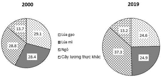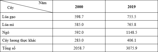 Cho bảng số liệu: SẢN LƯỢNG LƯƠNG THỰC CỦA THẾ GIỚI NĂM 2000 VÀ NĂM 2019 (Đơn vị: Triệu