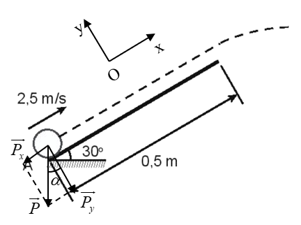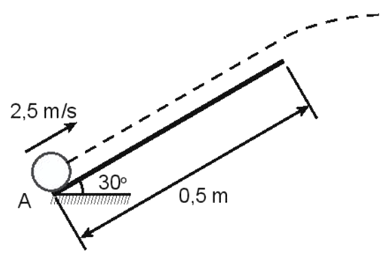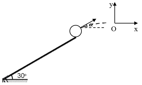 Một quả bóng khối lượng ban đầu 200 g được đẩy với vận tốc ban đầu 2,5 m/s lên một mặt phẳng nghiêng, nhẵn, dài 0,5 m, hợp với phương nằm ngang góc \({30^0}\) (hình vẽ). Quả bóng chuyển động như một vật bị ném. Bỏ qua lực cản của không khí. Tìm giá trị nhỏ nhất của động năng quả bóng trong quá trình nó chuyển động.