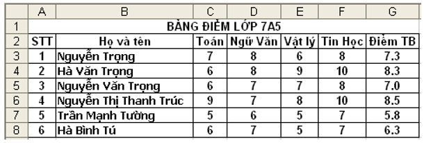 Cho bảng tính dưới đây
