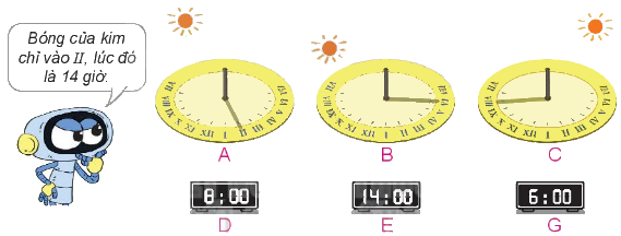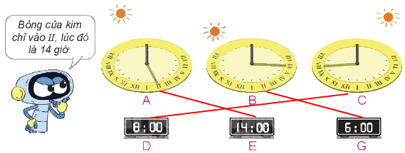 Quan sát xem bóng của kim chỉ vào số nào, sau đó nối với đồng hồ số thích hợp.