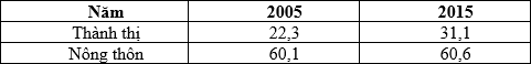 Cho bảng số liệu: SỐ DÂN THÀNH THỊ VÀ NÔNG THÔN NƯỚC TA, GIAI ĐOẠN 2005 - 2015