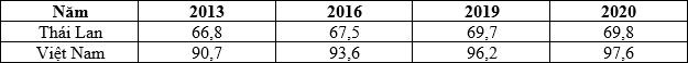Cho bảng số liệu: DÂN SỐ CỦA THÁI LAN VÀ VIỆT NAM, GIAI ĐOẠN 2013 - 2020(Đơn vị: Triệu