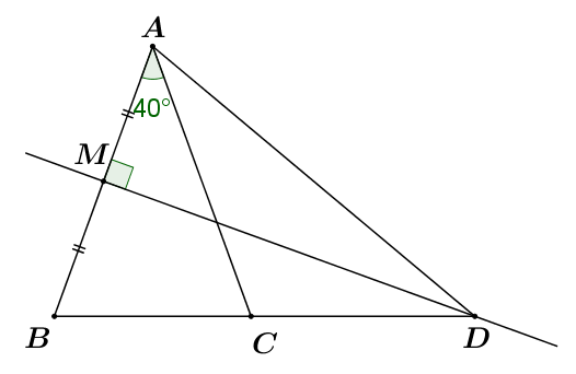 Cho tam giác ABC cân tại A có \(\angle A = {40^0}\), đường trung trực của AB cắt BC tại D. Tính