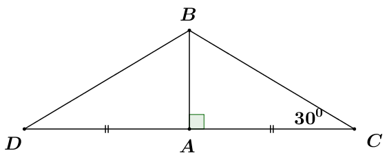 Tam giác ABC vuông tại A có \(\angle C = {30^0}\). Trên tia đối của tia AC lấy điểm D sao cho AD = AC.