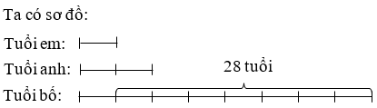 Tuổi em bằng \(\dfrac{1}{2}\) tuổi anh, tuổi anh bằng \(\dfrac{1}{4}\) tuổi bố. Biết bố hơn em 28