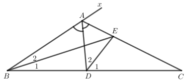 Cho \(\Delta ABC\) có \(\angle A = 100^\circ \), các đường phân giác \(AD,BE\). Tính số đo \(\angle BED\)?