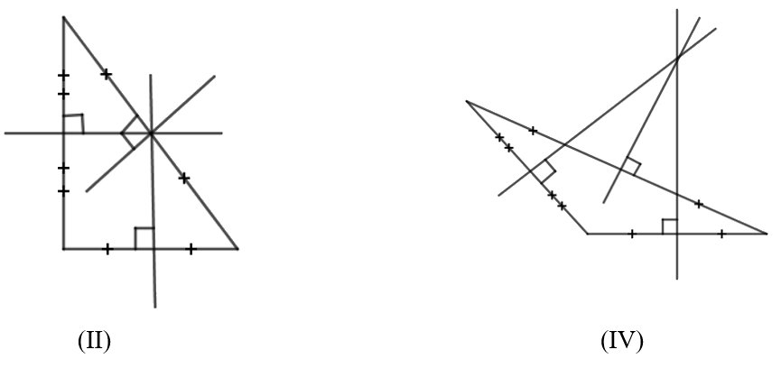 Cho các nhận xét sau:(I) Giao điểm của ba đường trung trực trong một tam giác bất kì luôn nằm