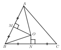Cho \(\Delta ABC\) có M và N lần lượt là trung điểm của AB, BC. Từ M, N vẽ hai đường trung trực