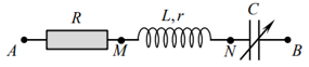Đặt điện áp \(u = 60\sqrt 2 .cos\left( {300t + \dfrac{\pi }{3}} \right)V\) vào hai đầu đoạn mạch AB như hình bên, trong đó \(R = 170\Omega \) và điện dung C của tụ điện thay đổi được. Khi \(C = {C_1}\) thì điện tích của bản tụ điện nối vào N là \(q = 5\sqrt 2 {.10^{ - 4}}.cos\left( {300t + \dfrac{\pi }{6}} \right)C\). Trong các biểu thức, t tính bằng s. Khi \(C = {C_2}\) thì điện áp hiệu dụng giữa hai đầu R đạt giá trị cực đại, giá trị đó bằng