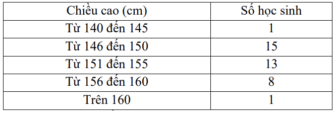 Cho bảng thống kê chiều cao của học sinh lớp 6A: