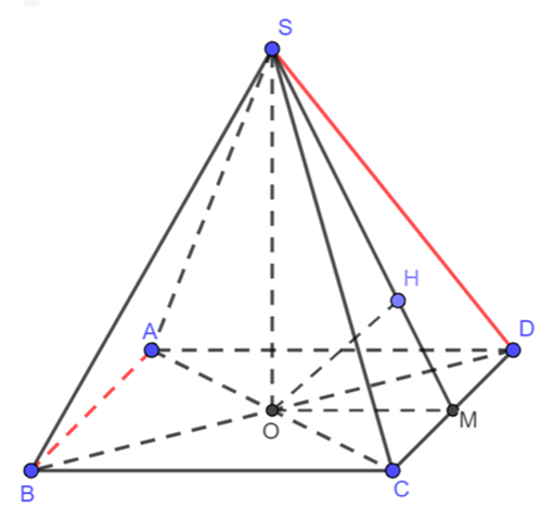 Cho hình chóp đều S.ABCD có đáy ABCD là hình vuông cạnh bằng a, cạnh bên SA = 2a. Khoảng cách