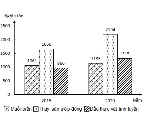 Theo biểu đồ, nhận xét nào sau đây đúng về sự thay đổi sản lượng muối biển, thủy sản ướp đông và dầu thực vật tinh luyện của nước ta năm 2020 so với năm 2015?
