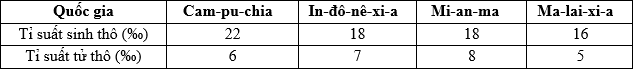 Cho bảng số liệu: TỈ SUẤT SINH THÔ VÀ TỈ SUẤT TỬ THÔ CỦA MỘT SỐ QUỐC GIA NĂM