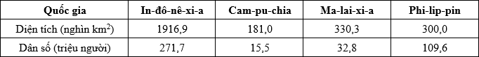Cho bảng số liệu: DIỆN TÍCH VÀ DÂN SỐ CỦA MỘT SỐ QUỐC GIA ĐÔNG NAM Á NĂM 2020 (Nguồn: Niên