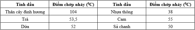 Điểm chớp cháy được áp dụng trong các quy định an toàn về vận chuyển, cục Hàng không Việt Nam đã có quy định: Tinh dầu là hàng hóa nguy hiểm nếu có điểm chớp cháy nhỏ hơn 600C. Quan sát bảng dưới, hãy cho biết các hãng hàng không có thể từ chối vận chuyển các loại tinh dầu nào?
