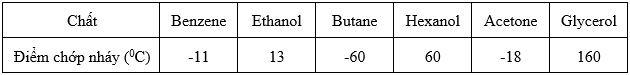 Dựa vào điểm chớp cháy của các chất hữu cơ dưới đây: