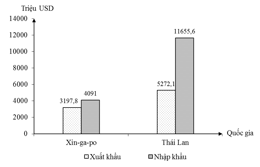 Cho biểu đồ: GIÁ TRỊ XUẤT, NHẬP KHẨU CỦA XIN-GA-PO VÀ THÁI LAN, NĂM 2019 (Số liệu theo Niên
