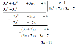Tìm \(a\) để đa thức \(3{x^3} + 4{x^2} + 3ax + 4\) chia cho đa thức \(x - 1\) dư \(5\).