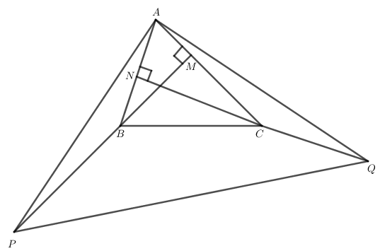 Cho \(\Delta ABC\) nhọn, hai đường cao \(BM\) và \(CN\). Trên tia đối của các tia \(BM\) lấy điểm \(P\) sao cho \(BP = AC\), trên tia đối của tia \(CN\) lấy \(Q\) sao cho \(CQ = AB\). Chứng minh rằng \(\Delta APQ\) vuông cân tại \(A\).