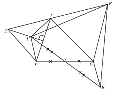 Cho \(\Delta ABC\), \(I\) là trung điểm của \(BC\). Vẽ ra phía ngoài của \(\Delta ABC\), hai tam giác đều \(ABE,ACF\). Gọi \(H\) là trực tâm của \(\Delta ABE\). Trên tia đối của tia \(IH\), lấy điểm \(K\) sao cho \(HI = IK\). Chứng minh :