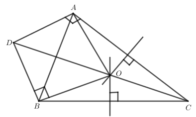 Cho \(\Delta ABC\). Đường trung trực của \(AC\) cắt đường trung trực của \(BC\) tại \(O\). Đường thẳng vuông góc với \(OA\) tại \(A\) cắt đường thẳng vuông góc với \(OB\) tại \(B\) ở \(D\). Chứng minh rằng: