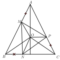 Cho \(\Delta ABC\) đều. Trên các cạnh \(AB,BC,CA\) lấy theo thứ tự ba điểm \(M,N,P\) sao cho \(AM = BN = CP\). \(O\) là giao điểm các đường trung trực của \(\Delta ABC\)