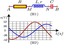 Đặt điện áp xoay chiều có tần số góc \(\omega \) vào hai đầu đọan mạch AB như hình bên. Hình H2 là đồ thị biểu diễn sự phụ thuộc của điện áp \({u_{AB}}\) giữa hai điểm A và B, và điện áp \({u_{MN}}\) giữa hai điểm M và N theo thời gian t. Biết \(63RC\omega = 16\) và \(r = 5\Omega \). Công suất tiêu thụ của đoạn mạch AB là