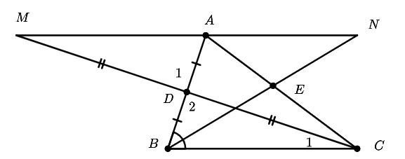 Cho tam giác ABC . Gọi D, E lần lượt là trung điểm của AB, AC. Trên tia đối của tia DC, lấy điểm M sao cho MD = CD. Trên tia đối của tia EB, lấy điểm N sao cho EN = BE. Chứng minh: A, M , N thẳng hàng và A là trung điểm của MN.
