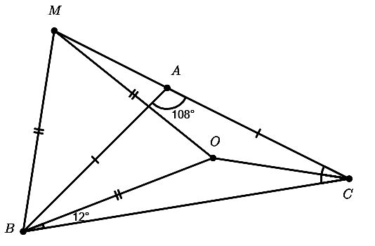 Cho tam giác ABC cân ở A , \(\angle{BAC} = {108^0}\), Gọi O là một điểm nằm trên tia phân giác của góc C sao cho \(\angle{CBO} = {12^0}\). Vẽ tam giác đều BOM ( M và A cùng thuộc một nửa mặt phẳng bờ BO). Chứng minh ba điểm C, A, M thẳng hàng.