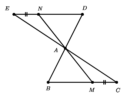 Cho tam giác ABC. Trên tia đối của AB lấy điểm D mà AD = AB, trên tia đối tia AC lấy điểm E mà AE = AC. Gọi M; N lần lượt là các điểm trên BC và ED sao cho CM = EN. Chứng minh ba điểm M; A; N thẳng hàng.