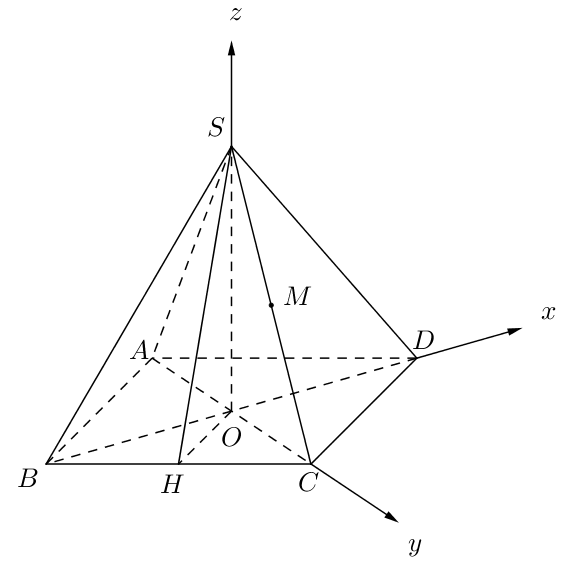 Chóp đều S.ABCD. Đáy ABCD là hình vuông cạnh a tâm O. Góc tạo bởi mặt bên (SBC) và đáy bằng \({45^0}\). Gọi M là trung điểm của SC. Tính khoảng cách giữa SM và AD.