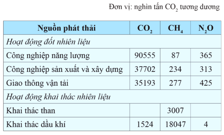 Báo cáo của Bộ Tài nguyên và Môi trường năm 2020 cho biết ước tính lượng khí nhà kính phát thải ở Việt Nam trong năm 2016 được cho bởi bảng: