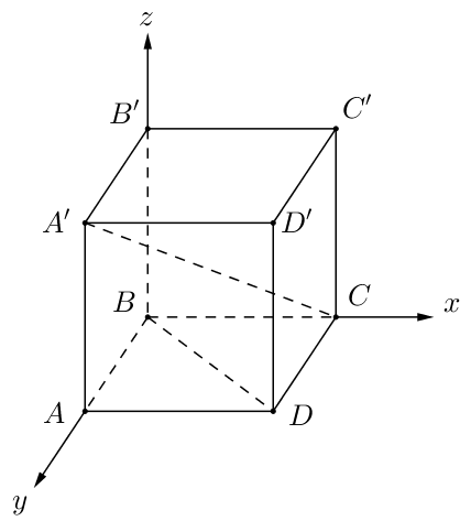 Cho hình hộp chữ nhật ABCD.A’B’C’D’, biết đáy ABCD là hình vuông. Tính góc giữa A’C và BD.