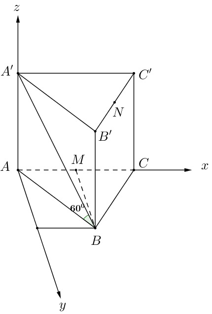 Cho lăng trụ đều ABC.A’B’C’ có AB = a và đường thẳng A’B tạo với đáy một góc bằng \({60^0}\). Gọi M và N lần lượt là trung điểm của các cạnh AC và B’C’. Tính độ dài đoạn MN.