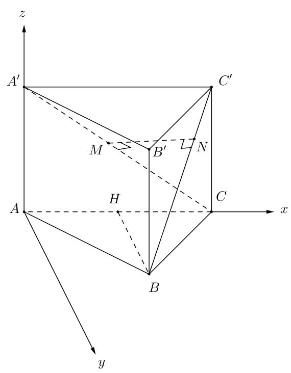 Cho hình lăng trụ tam giác đều ABC.A’B’C’ có cạnh bên bằng đáy. Đường thẳng MN (\(M \in