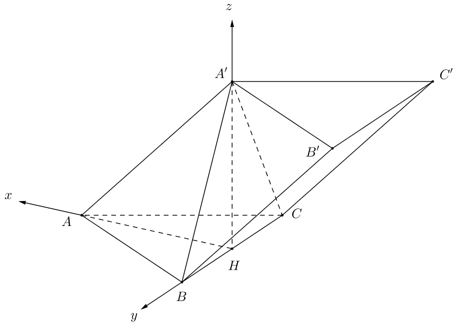 Cho khối lăng trụ ABC.A’B’C’ có đáy là tam giác ABC cân tại A, có \(AB = AC = 2a\), \(BC = 2a\sqrt