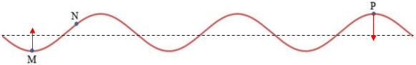 Tại một thời điểm nào đó, một sóng ngang có tần số 4Hz lan truyền trên một sợi dây và làm cho sợi dây có dạng như hình vẽ dưới đây. Biết rằng điểm M đang ở vị trí thấp nhất, điểm P đang ở vị trí cao nhất, còn điểm N đang chuyển động đi xuống và khoảng cách giữa hai điểm M và P theo phương ngang là 50cm. Hãy cho biết sóng truyền theo chiều nào và với tốc độ bao nhiêu?