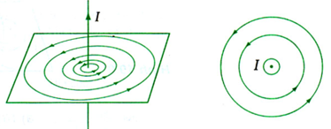 Một dây dẫn điện thẳng được đặt vuông góc với mặt phẳng như hình vẽ. Đường sức từ