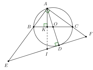 b) Gọi I là trung điểm của EF và K là hình chiếu vuông góc của A trên cạnh BC . Chứng minh ba điểm A,K,1 thẳng hàng.