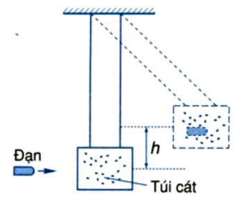 Bắn một viên đạn khối lượng m = 10 g với vận tốc v vào một túi cát được treo nằm yên có khối lượng M = 1 kg. Va chạm là mềm, đạn mắc lại trong túi cát và chuyển động cùng với túi cát. Sau va chạm, túi cát được nâng lên độ cao h = 0,8 m so với vị trí cân bằng ban đầu. Hãy tìm vận tốc của đạn (túi cát được gọi là con lắc thử đạn vì nó cho phép xác định vận tốc của đạn). Lấy \(g = 10\,\,m/{s^2}\).