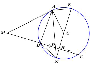 1) Từ điểm M nằm ngoài đường tròn (O;R) kẻ tiếp tuyến MA (A là tiếp điểm) và cát tuyến MBC không đi qua tâm O (điểm B nằm giữa hai điểm M và C). Gọi H là trung điểm của BC. Đường thẳng OH cắt đường tròn (O;R) tại hai điểm N, K (trong đó K thuộc cung BAC). Gọi D là giao điểm của AN và BC.