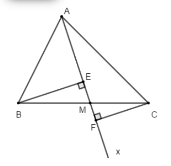 Cho tam giác ABC nhọn. Vẽ tia Ax nằm trong góc BAC, Ax cắt BC ở M. Gọi E và F theo thứ tự là hình chiếu của B và C trên tia Ax. So sánh BE + CF với BC.