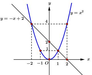 Cho parabol \(\left( P \right):\,\,y = {x^2}\) và đường thẳng \(\left( d \right):\,\,y = - x + 2\).