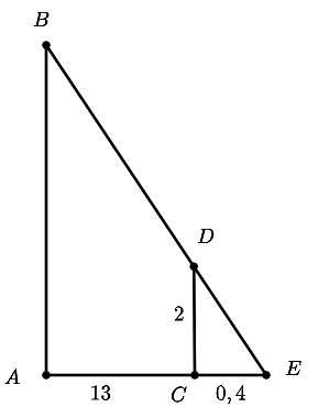 Để đo chiều cao 4B của tượng phật Bồ tát tại chùa Linh Ứng (Bãi Bụt - Sơn Trà - Thành phố Đà Nẵng) bằng ánh nắng mặt trời, người ta dùng một chiếc cọc CD cao 2m đặt thẳng đứng. Khi bóng của điểm B và D trên mặt đất trùng nhau tại vị trí điểm E (minh họa bằng hình vẽ), người ta đo được \(CE = 0,4m;{\rm{ }}CA = 13m\). Chiều cao của tượng phật Bồ tát bằng
